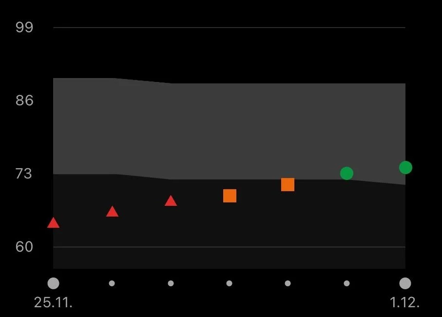 This image shows the Garmin data (Heart Rate Variability) from a user who went from exhausted to recovered in 6 days. They listened to Audicin for 10 mins a day - NO OTHER CHANGES to their lifestyle.