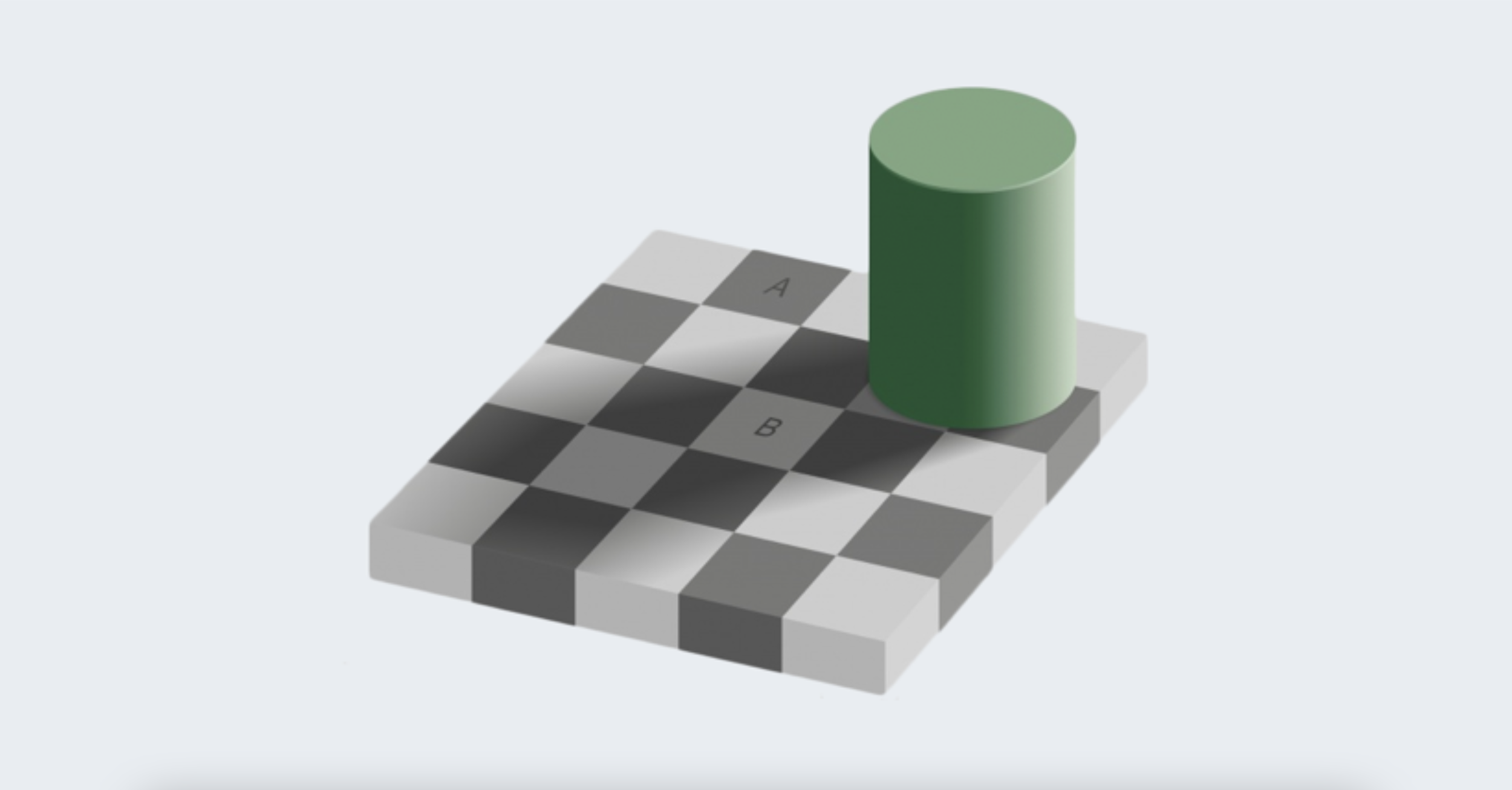 Consider the example of this famous visual illusion. The checker shadow illusion is a classic. Squares A and B appear to us to be different colours when in reality they are exactly the same.